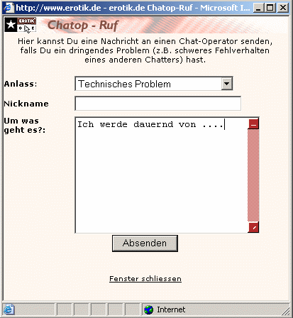 - Bei dringenden Fällen kannst Du als registrierter Chatter den sog. Chatop-Ruf nutzen: Hier kannst Du eine kurze Mitteilung an die Chatops senden. Falls gerade einer oder eine online ist, wird er oder sie sich alsbald darum kümmern