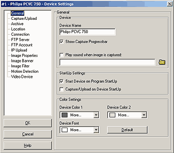 Wer noch weitere Einstellungen wie z.B. die automatische Nummerierung und Archivierung der Bilder (sehr praktisch !) vornehmen möchte, hat unter dem Menüpunkt "Device -> Kameraname" ausreichend Gelegenheit dazu: