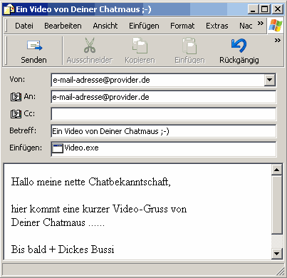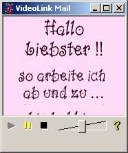 | Ihr wollt Eure neue Chat-Bekanntschaft beeindrucken ? Dann versucht es doch mal mit einer Videomail ! Bilder per Mail kann jeder versenden. Oft kann mann oder frau dabei auch gar nicht so gut "rüber". Viel besser und etwas Besonderes ist eine kurze und - vor allem - persönliche Video-Botschaft per E-Mail zu senden. Bei den meisten Kameras wird eine entsprechende Software mitgeliefert. Unsere Philips ToUcam 750 hat z.B. VideoLink Mail von Smith Micro Software dabei. Wer keine noch keine passende Software hat, kann z.B. VideoLink Mail beim Hersteller für 29,95 US-$ online kaufen [Link]